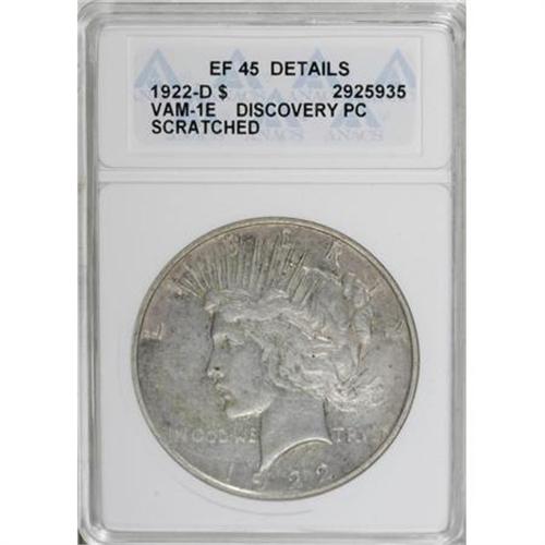 <B>1922-D $1 --Scratched--ANACS. XF45 Details. </B></I>VAM-1E Discovery Piece. NGC Census: (5/4610). PCGS Population (15/6857). Mintage: 15,063,000. Numismedia Wsl. Price for NGC/PCGS coin in XF45: $13. (#7358)<BR><BR><B>Coin Engraver:</B> Anthony de Francisci<BR><BR><b>Shipping:</b> Coins & Currency (<a target="_blank" href="http://www.heritageauctions.com/common/shipping.php">view shipping information</a>)