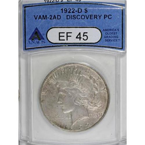 <B>1922-D $1 XF45 ANACS.</B></I> VAM-2AD Discovery Piece. NGC Census: (5/4610). PCGS Population (15/6857). Mintage: 15,063,000. Numismedia Wsl. Price for NGC/PCGS coin in XF45: $13. (#7358)<BR><BR><B>Coin Engraver:</B> Anthony de Francisci<BR><BR><b>Shipping:</b> Coins & Currency (<a target="_blank" href="http://www.heritageauctions.com/common/shipping.php">view shipping information</a>)