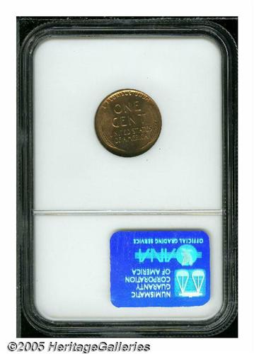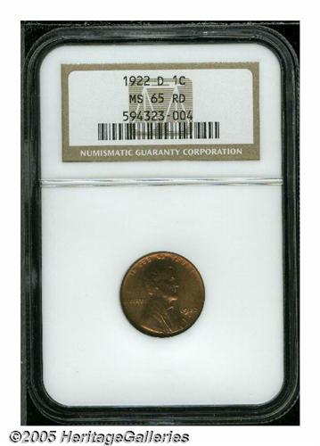 <B>1922-D<1C> MS65 Red NGC.</B></I> Deep cherry-violet color blankets the obverse, the reverse is a brighter golden color. Well struck, save for a little weakness on the mintmark, a couple of minor carbon flecks show on the obverse.