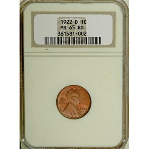 <B>1922-D 1C MS65 Red NGC.</B></I> The strike is atypically bold for the issue, with detailed sharpness on Lincoln's coat, beard, and hair. The fully lustrous surfaces are generally mark-free and display varying hues of reddish patina. A nice, appealing example of this popular semikey date.<BR><BR><B>Coin Engraver:</B> Victor D. Brenner<BR><BR><b>Shipping:</b> Coins & Currency (<a target="_blank" href="http://www.heritageauctions.com/common/shipping.php">view shipping information</a>)