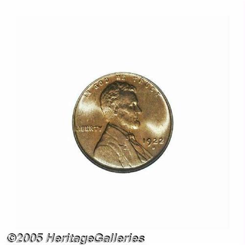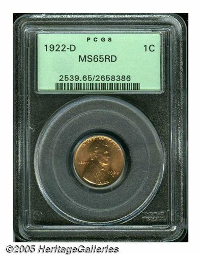 <B>1922-D<1C> MS65 Red PCGS.</B></I> A well struck example of this notoriously poorly manufactured date. Most all of the details are sharply defined, and the luster is bright with a coppery-orange appearance, which is imbued with lime-green accents on the reverse. A few minute marks scattered about are not bothersome. Population: 74 in 65, 9 finer (6/05).