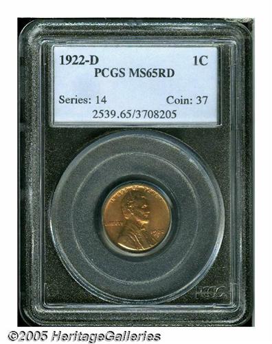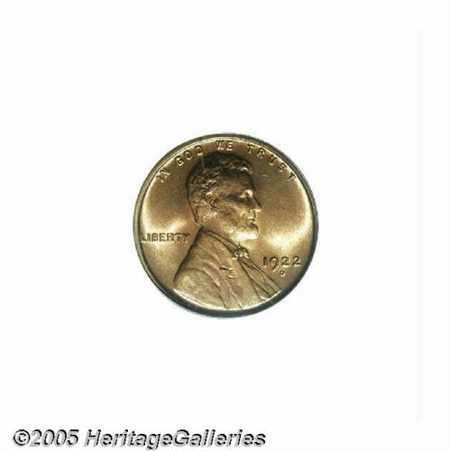 <B>1922-D<1C> MS65 Red PCGS.</B></I> Well struck and fully lustrous, with subtly variegated toning and a modest amount of carbon over the two sides. A handful of tiny nicks, on the portrait of Mr. Lincoln, are only visible with a magnifier. Population: 74 in 65 Red, 9 finer (6/05).<BR><I>From The William Bickel Collection, Part One.</B></I>