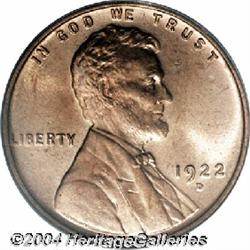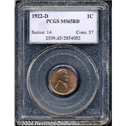 <B>1922-D<1C> MS65 Red PCGS.</B></I> An attractive full Gem specimen of this uncommon and often poorly struck issue. Fully struck on the obverse including almost complete beard detail but a bit weak through the upper left reverse features. Bright pinkish-red and highly lustrous, with satiny surfaces lightly dusted by a few flyspecks One contact mark is mentioned on Lincoln's nose. <BR><BR><B>Important notice:</B> Heritage usually auctions material at the rate of 200-250 lots per hour. On some occasions eBay Live bid software or the Internet may not be able to keep up with the pace of the auction. We recommend placing a realistic absentee bid now as insurance to avoid disappointment. Occasionally the auctioneer may eliminate or reject an eBay Live bid, and the auctioneer may also reopen a lot after the close of the eBay live bidding (usually because we missed an audience bid), and may reject your bid even if it shows you as the winning bidder. By bidding via eBay Live, you agree that Heritage may award the lot to another bidder at its sole discretion under the circumstances described above or any other reasonable circumstances. Since eBay bids are not shown to us until we open the lot on the floor, we treat those bids just like floor bids. In most cases the floor responds before the eBay bid is presented to us, due to Internet lag time, so for consistency we have made it a policy that floor bids are always considered first over tie eBay live bids. Also please note that all Heritage lots purchased through eBay Live carry a 20% Buyer's Premium. Please make sure you read the Terms and Conditions before you bid.