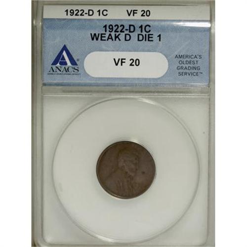 <B>1922-D 1C Weak D VF20 ANACS.</B></I> Die 1. NGC Census: (21/220). PCGS Population (17/207). Mintage: 15,274,000. Numismedia Wsl. Price for NGC/PCGS coin in VF20: $13.50. (#2537)<BR><BR><B>Coin Engraver:</B> Victor D. Brenner<BR><BR><b>Shipping:</b> Coins & Currency (<a target="_blank" href="http://www.heritageauctions.com/common/shipping.php">view shipping information</a>)