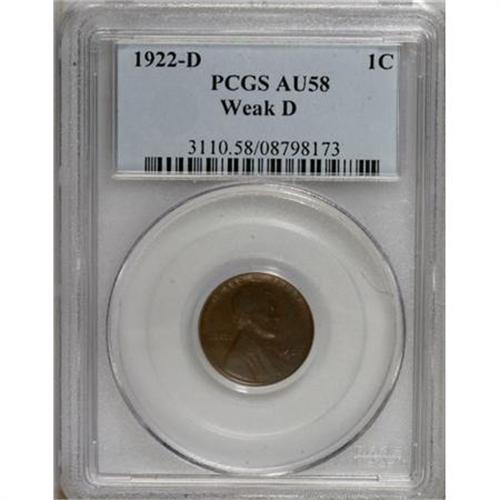 <B>1922-D 1C Weak D AU58 PCGS.</B></I> Die Pair 1. The reverse shows the diagnostic die crack through the O in ONE on the weak reverse. The chocolate-brown surfaces show minor friction, and the upper left corner of the mintmark is visible to the unaided eye.<BR><BR><B>Coin Engraver:</B> Victor D. Brenner<BR><BR><b>Shipping:</b> Coins & Currency (<a target="_blank" href="http://www.heritageauctions.com/common/shipping.php">view shipping information</a>)