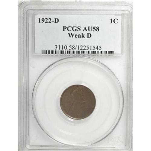 <B>1922-D 1C Weak D AU58 PCGS.</B></I> Die Pair 1. Just the faintest trace of the D can be made out with a strong magnifier, the mintmark being obscured by grease on the die or some other debris. The reverse shows a pronounced die crack from the rim through the O in ONE. The brown surfaces show just the slightest tinge of underlying red, and there is a significant amount of mint luster on each side. A lovely, defect-free example of this rare and popular Lincoln cent.<BR><BR><B>Coin Engraver:</B> Victor D. Brenner<BR><BR><b>Shipping:</b> Coins & Currency (<a target="_blank" href="http://www.heritageauctions.com/common/shipping.php">view shipping information</a>)