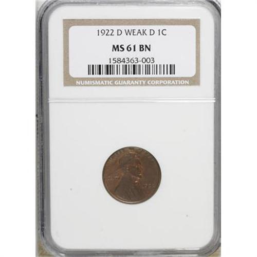 <B>1922-D 1C Weak D MS61 Brown NGC.</B></I> NGC Census: (0/0). PCGS Population (0/18). (#3110)<BR><BR><B>Coin Engraver:</B> Victor D. Brenner<BR><BR><b>Shipping:</b> Coins & Currency (<a target="_blank" href="http://www.heritageauctions.com/common/shipping.php">view shipping information</a>)