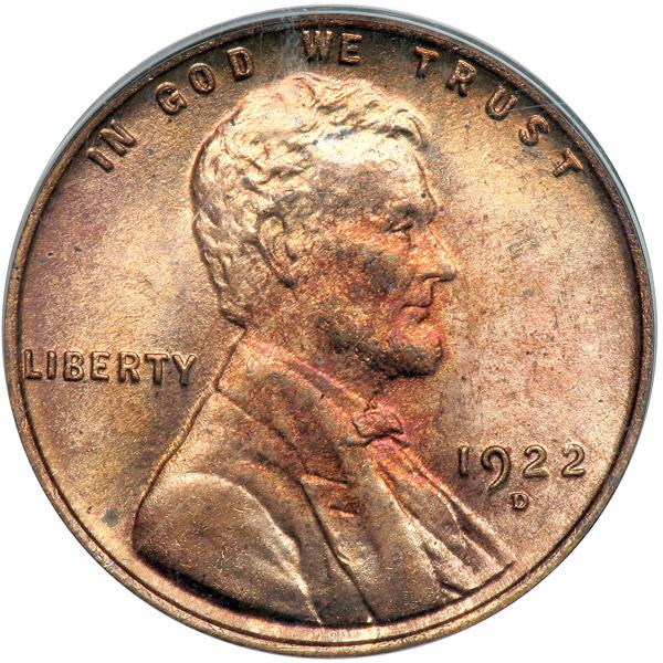 1922-D Lincoln Cent. PCGS graded MS-65 Red. Well struck with over 70% mint red. A rarity indeed, most 1922-D Cents that have survived in Mint condition unscathed from circulation are at best R&B, but very rarely display vibrant color. Appreciably better than most. Squarely in the Gem BU class! Pop 82; 10 finer in 66 (PCGS # 2539) .