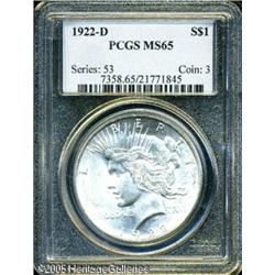 <B>1922-D<img border='0' src='http://www.heritagecoins.com/images/star.gif' width=10 height=10>$1 MS65 PCGS.</B></I> Sharply struck, with bright, lustrous surfaces that are essentially untoned. Lot:10686