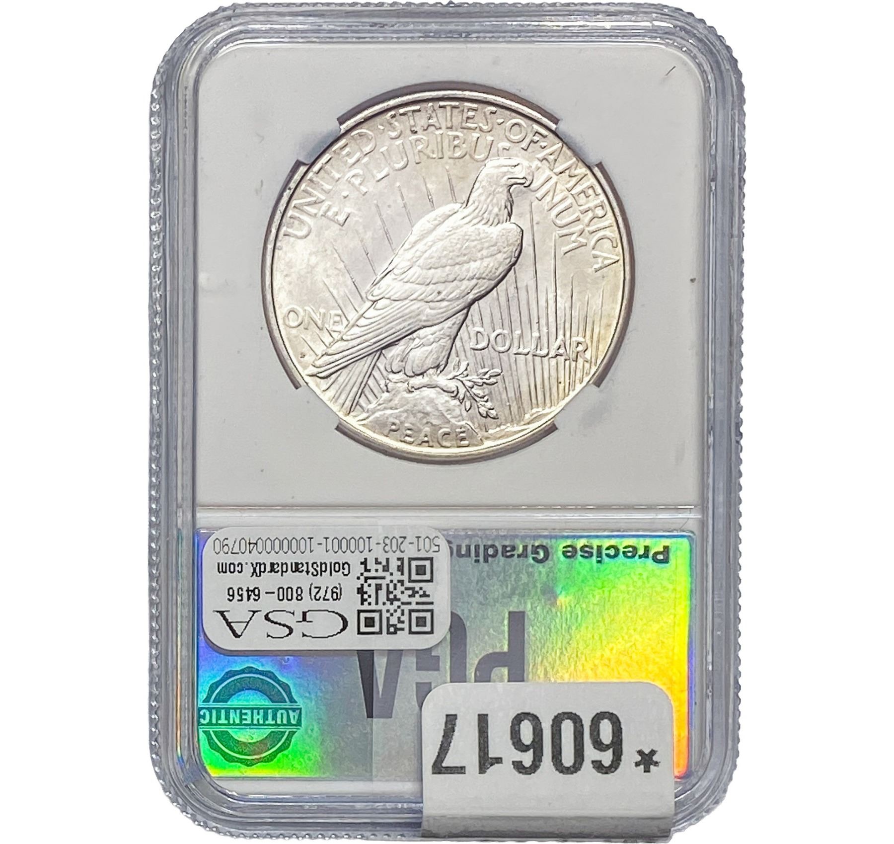 l. All non-certified coins and currency are guaranteed genuine, but are not guaranteed as to grade, since grading is a matter of opinion, an art and not a science, and therefore the description rendered by GSA or any third-party grading service may not agree with the opinion of others (including trained experts), and the same expert may not grade the same item with the same grade at two different times. GSA may, but is not obligated to, express an opinion as to non-certified numismatic items, in GSA’s opinion, or by its employees’ experience and the current interpretation of the American Numismatic Association’s standards as of the date the catalog was prepared. There is no guarantee or warranty expressed or implied that the grading opinions utilized by GSA, if any, will meet the standards of any grading service at any time in the future.