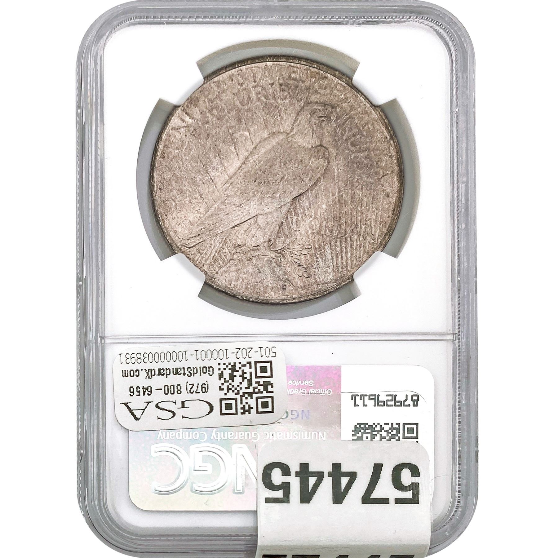 e. Coins sold referencing a third-party grading service are sold “AS IS” without any express or implied warranty, except for a guarantee by GSA that they are genuine. Removal or alteration of the holder, voids all of Bidder’s claims concerning that Product. Certain warranties may be available from the grading services and Bidders are referred to them for further details: Numismatic Guaranty Corporation (NGC), PO Box 4776, Sarasota, FL 34230, www.ngccoin.com/services/writtenguarantee.asp; Professional Coin Grading Services (PCGS), PO Box 9458, Newport Beach, CA 92658, www.pcgs.com/guarantee.html; ANACS, 6555 S. Kenton St., Ste. 303, Englewood, CO 80111; and Independent Coin Grading Co. (ICG), 7901 East Bellview, Ave., Suite 50, Englewood, CO 80111.