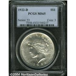 <B>1922-D<S$1> MS65 PCGS.</B></I> Well struck for the series, this all white Gem has several light luster grazes on Liberty's neck and in the left obverse field that keep this piece from the lofty MS66 level. <BR><BR><B>Important notice:</B> Heritage usually auctions material at the rate of 200-250 lots per hour. On some occasions eBay Live bid software or the Internet may not be able to keep up with the pace of the auction. We recommend placing a realistic absentee bid now as insurance to avoid disappointment. Occasionally the auctioneer may eliminate or reject an eBay Live bid, and the auctioneer may also reopen a lot after the close of the eBay live bidding (usually because we missed an audience bid), and may reject your bid even if it shows you as the winning bidder. By bidding via eBay Live, you agree that Heritage may award the lot to another bidder at its sole discretion under the circumstances described above or any other reasonable circumstances. Since eBay bids are not shown to us until we open the lot on the floor, we treat those bids just like floor bids. In most cases the floor responds before the eBay bid is presented to us, due to Internet lag time, so for consistency we have made it a policy that floor bids are always considered first over tie eBay live bids. Also please note that all Heritage lots purchased through eBay Live carry a 20% Buyer's Premium. Please make sure you read the Terms and Conditions before you bid. </span></font></tr></table></td></tr></table>