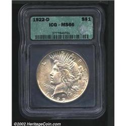1922-D S$1 MS66 ICG. Sharply struck with bright, sparkling mint luster and showing just a hint of light golden color on each side. Important notice: We expect to be auctioning lots at the rate of 200-250 per hour. Sometimes eBay Premier live bid software cannot keep up with that pace, so we strongly recommend that you place a realistic proxy bid now as insurance to avoid disappointment. Also please note that all Heritage/CAA lots purchased through eBay Premier carry a 20% Buyer's Premium.