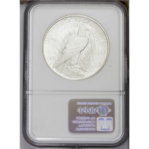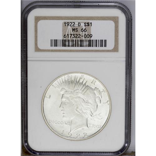<B>1922-D<img border='0' src='http://www.heritagecoins.com/images/star.gif' width=10 height=10>$1> MS66 NGC.</B></I> A wonderful Gem with stunning silver luster and frosty surfaces, the reverse exhibiting a trace of reflectivity in the fields. Only a few finer examples have been certified.<BR><I>From The David L. Goodwin Collection.</B></I> <BR><BR><B>Important notice:</B> Heritage usually auctions material at the rate of 200-250 lots per hour. On some occasions eBay Live bid software or the Internet may not be able to keep up with the pace of the auction. We recommend placing a realistic absentee bid now as insurance to avoid disappointment. Occasionally the auctioneer may eliminate or reject an eBay Live bid, and the auctioneer may also reopen a lot after the close of the eBay live bidding (usually because we missed an audience bid), and may reject your bid even if it shows you as the winning bidder. By bidding via eBay Live, you agree that Heritage may award the lot to another bidder at its sole discretion under the circumstances described above or any other reasonable circumstances. Since eBay bids are not shown to us until we open the lot on the floor, we treat those bids just like floor bids. In most cases the floor responds before the eBay bid is presented to us, due to Internet lag time, so for consistency we have made it a policy that floor bids are always considered first over tie eBay live bids. Also please note that all Heritage lots purchased through eBay Live carry a 20% Buyer's Premium. Please make sure you read the Terms and Conditions before you bid. This lot is being auctioned in conjunction with a live floor auction by Heritage Galleries & Auctioneers. All final auction and invoice information will be supplied by Heritage Galleries & Auctioneers, and all other information should be considered preliminary. Lot:3830 <BR><BR><B>Winning Notification and Billing:</B> After the FINAL session in this auction is complete, Heritage will send e-mail and snail mail invoices. This process normally takes several days. All final auction and invoice information will be supplied by Heritage Galleries & Auctioneers, and all other information should be considered preliminary. <BR><BR>This auction will be conducted on a live auction floor and over the Internet through eBay Live. If you choose to place an absentee bid, please take a moment to <font color='#0000ff'><u><a href='http://pages.ebay.com/liveauctions/help/before/laabsentee.html'>learn how eBay Live absentee bidding works</a></u></font><font color='#000000'>