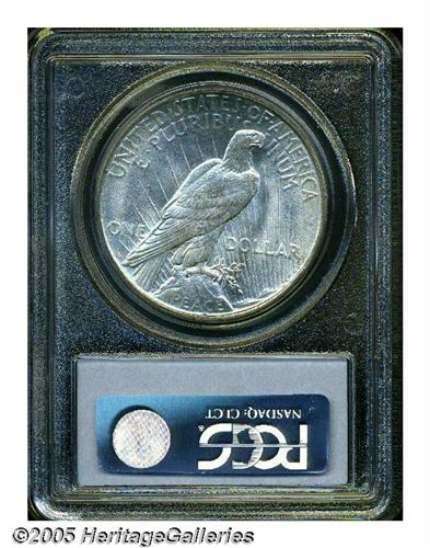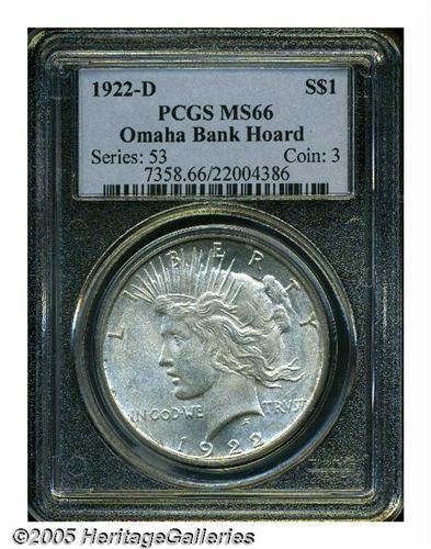 <B>1922-D<S$1> MS66 PCGS.</B></I> Ex: Omaha Bank Hoard. Lustrous surfaces, somewhat pebbly with little color. Above average strike, some long spindly die breaks wind across the surfaces.
