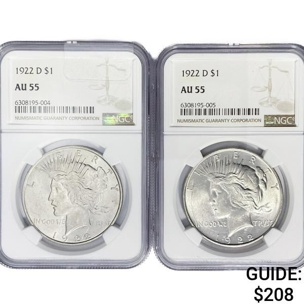 1922-D Set (2) Silver Peace Dollar NGC AU55