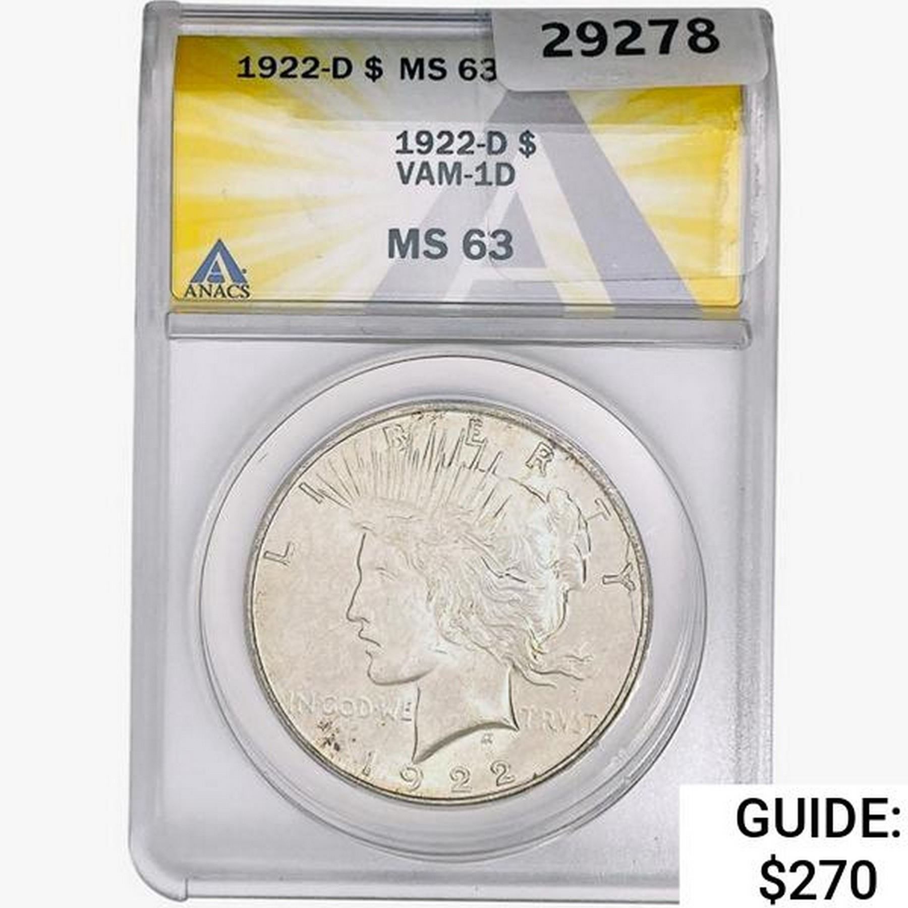 1922-D Silver Peace Dollar ANACS MS63 VAM-1D