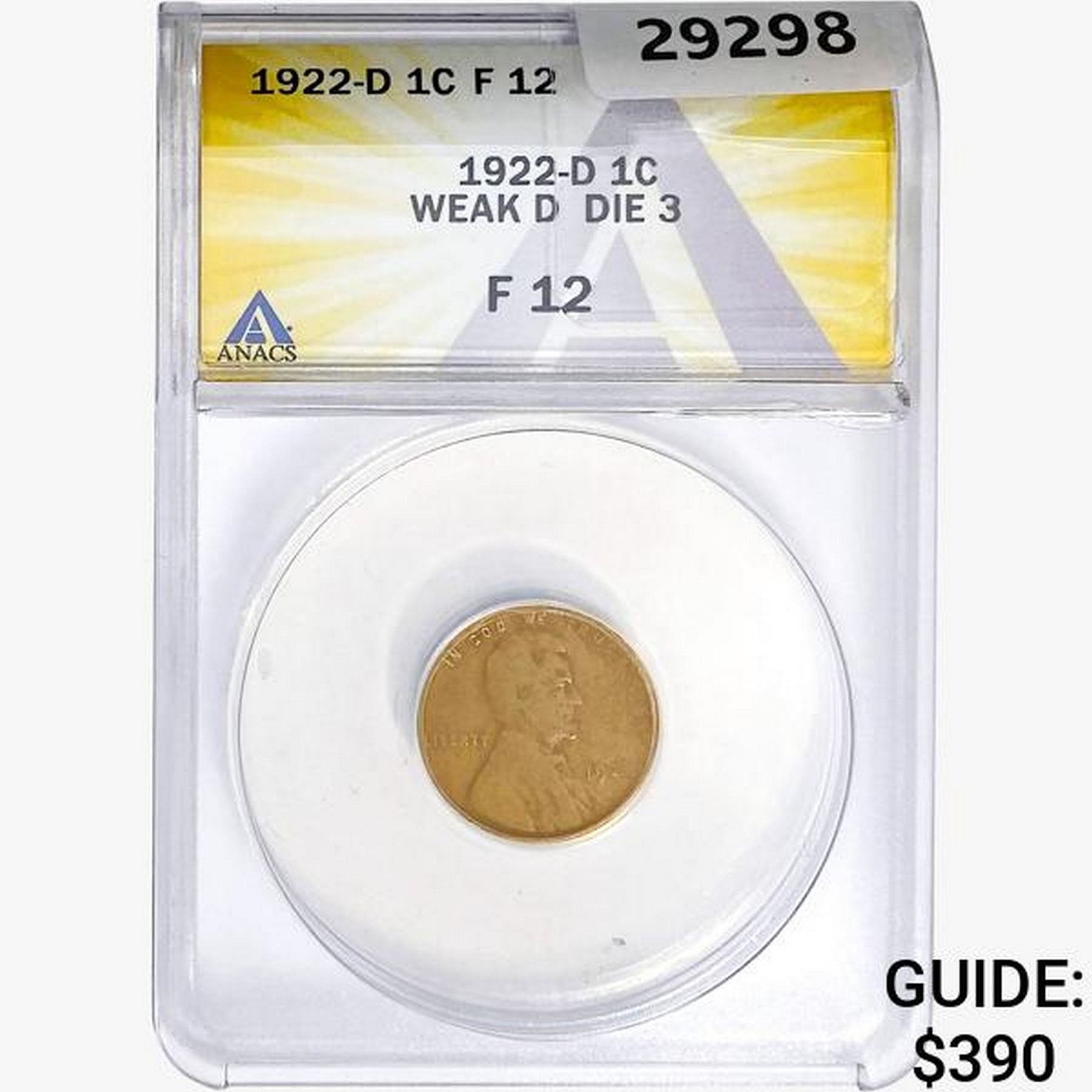 1922-D Wheat Cent ANACS F12 Weak D Die 3