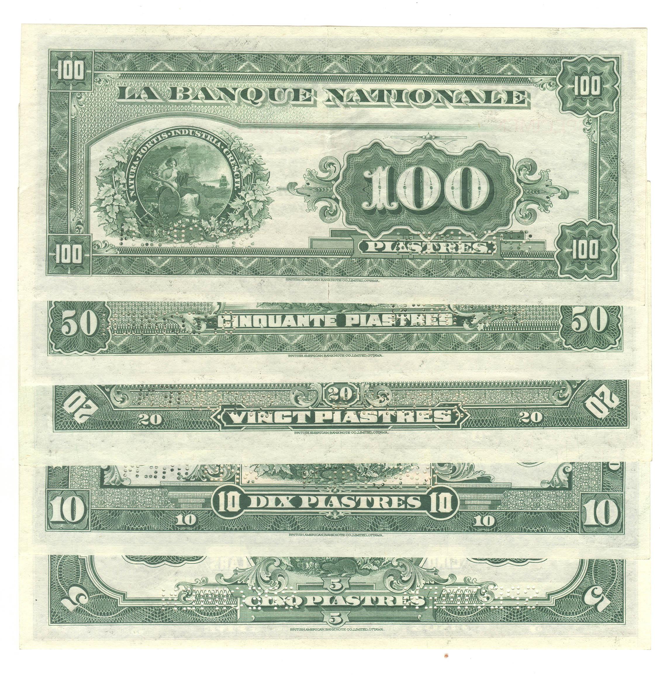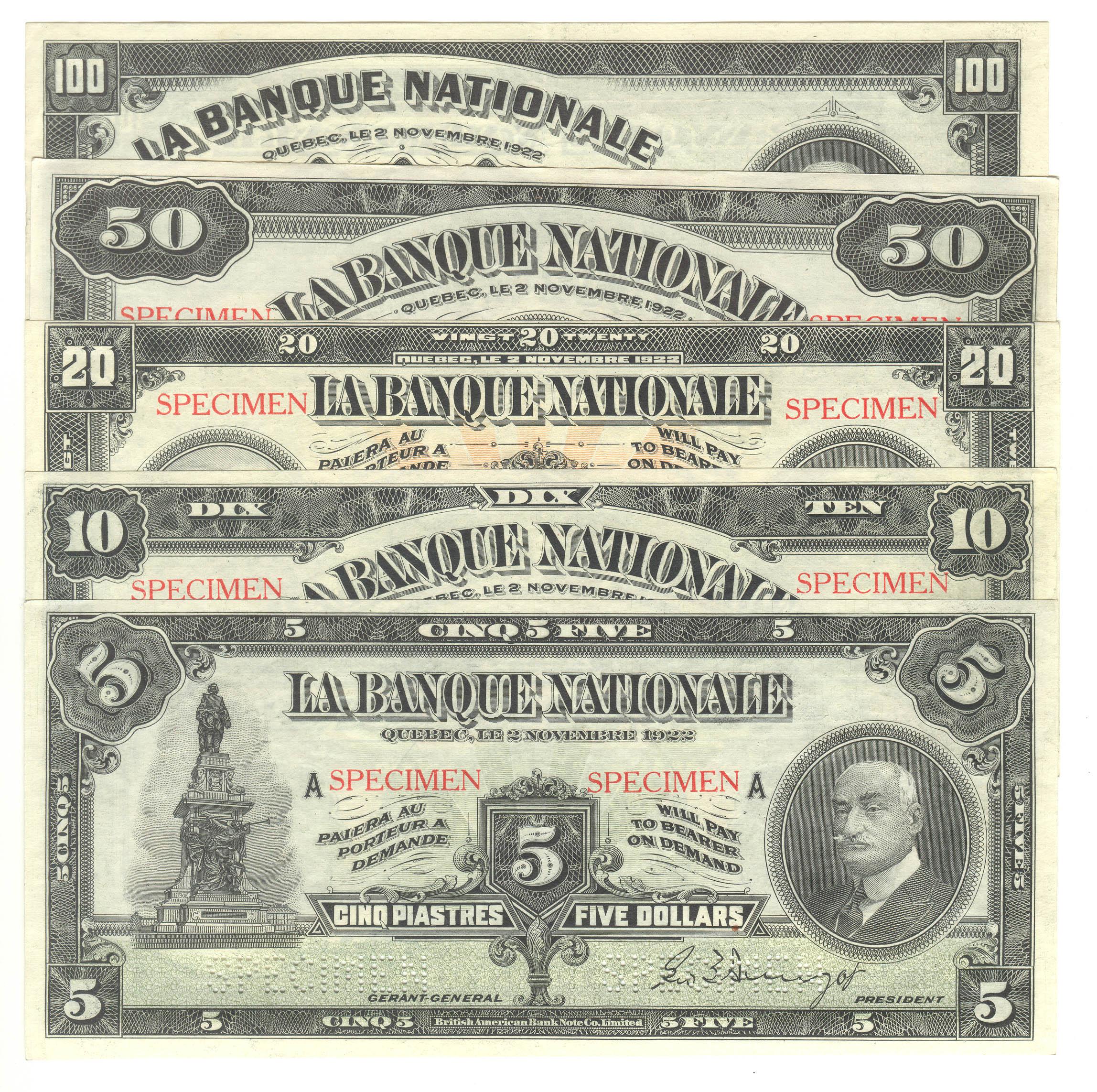 1922 Five, Ten, Twenty, Fifty & One Hundred Dollars La Banque Nationale, $5 to $50 UNC, $100 EF, CH 510-22-02S, 04S, 06S, 08S & 10S, All 5 notes Specimen.