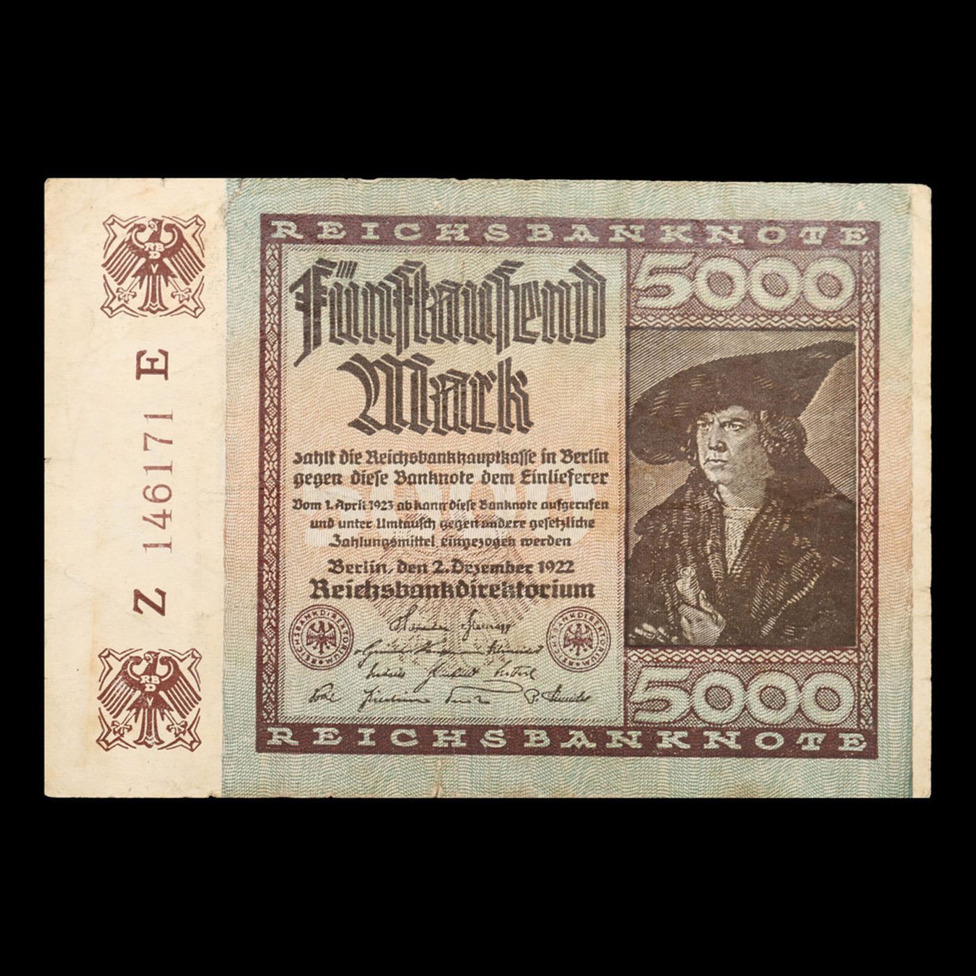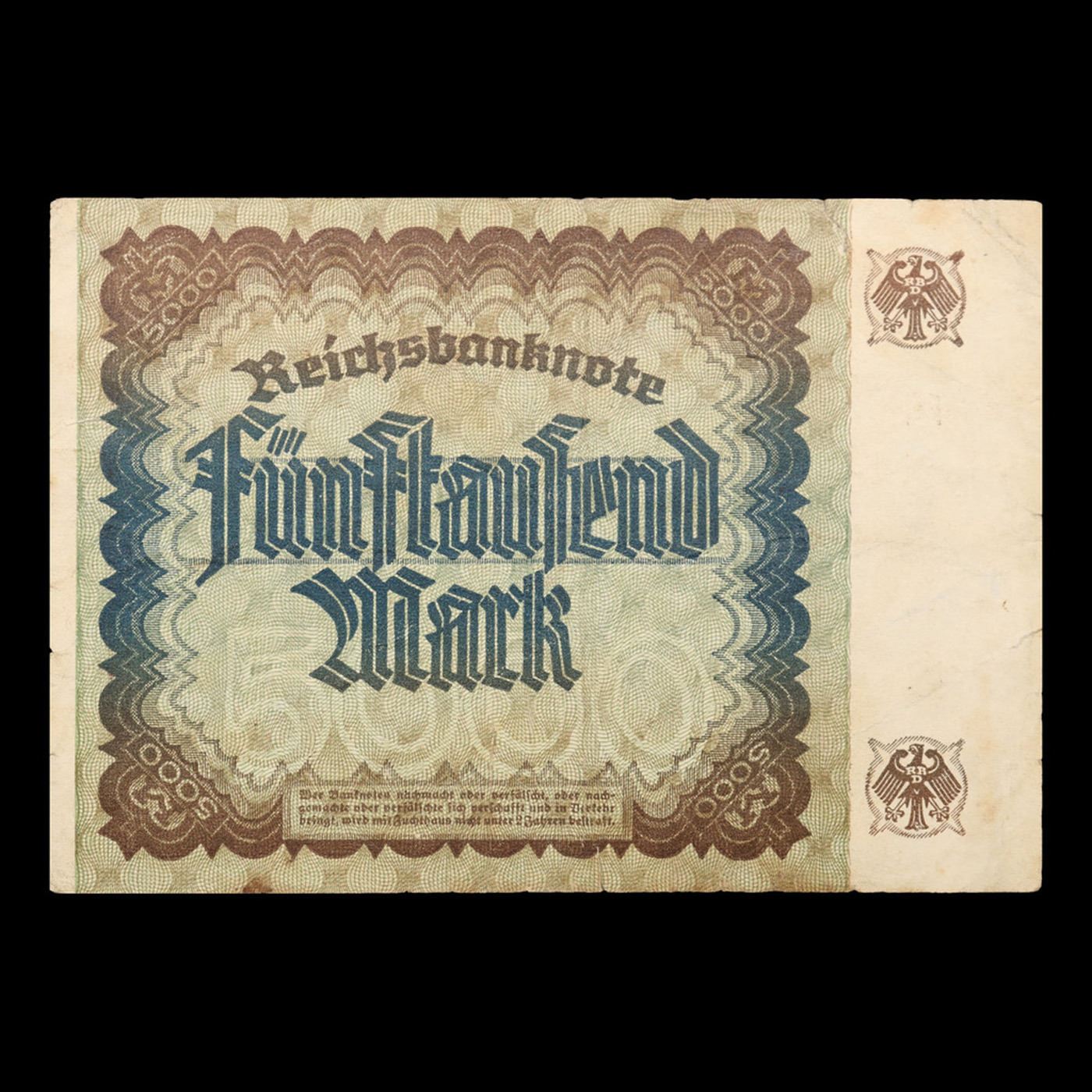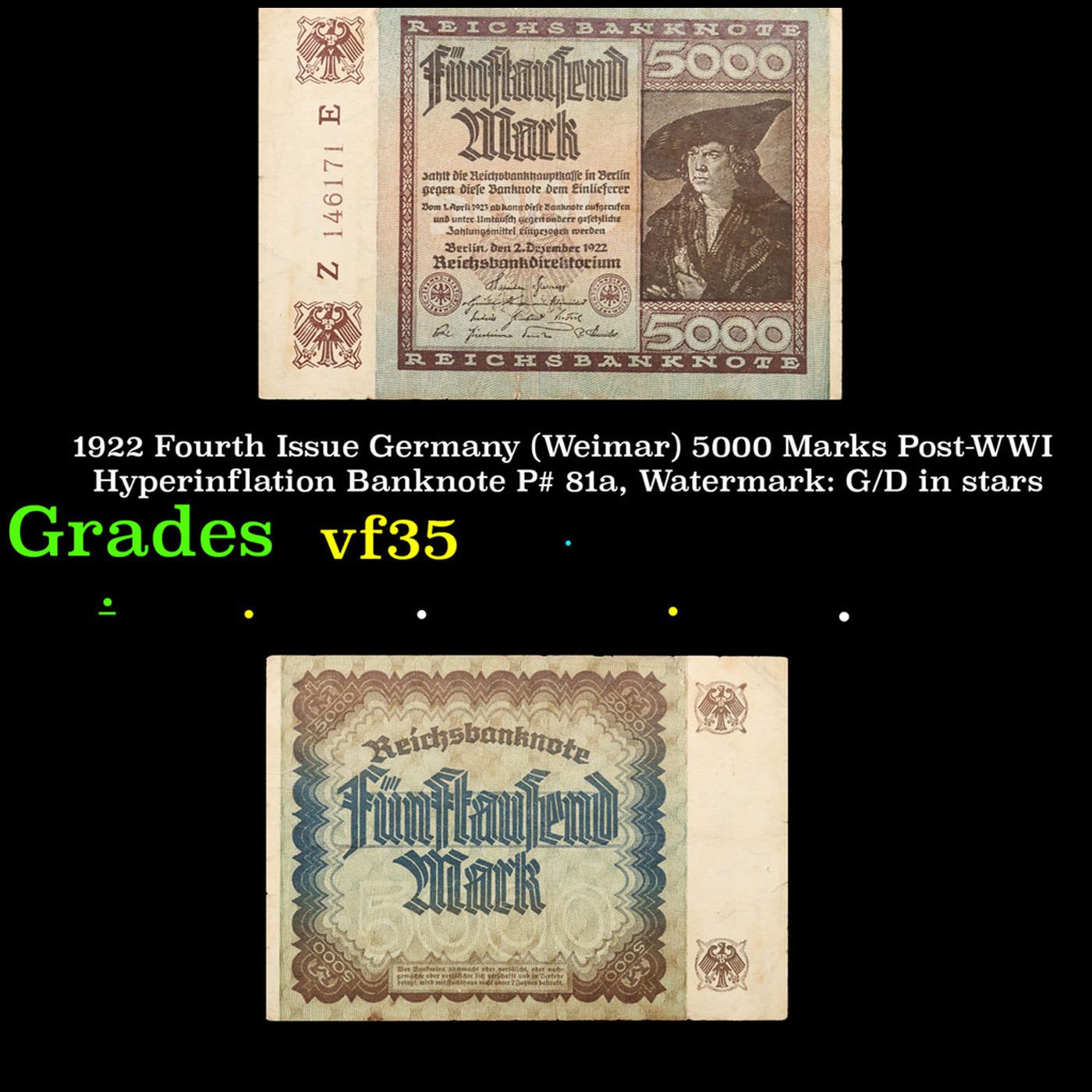1922 Fourth Issue Germany (Weimar) 5000 Marks Post-WWI Hyperinflation Banknote P# 81a, Watermark: G/D in stars Grades vf++. In the early 1920s, post-WWI Germany saw its economy spiraling out of control. Hyperinflation started directly after the war in 1918, but truly took over the Weimar Republic from 1921 to 1923. The value of the Mark declined incredibly rapidly. 1 USD was equal to 50 German Marks at the beginning of 1920. Toward the end of 1923, 1 USD was equal to over 4,200,000,000,000 German Marks. At times, denominations of the Mark became less valuable than the paper and labor to print it almost immediately after printing. Thus, denominations of the Mark notes became incredibly large, ending up in the tens of trillions.