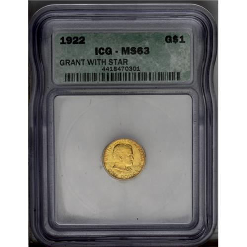 <B>1922<G$1> Grant with Star MS63 ICG.</B></I> Reddish-gold undertones peer through slightly muted luster. A well detailed representative with no outwardly distracting abrasions.<BR><I>From The Steve Glenn Collection.</B></I> <BR><BR><B>Important notice:</B> Heritage usually auctions material at the rate of 200-250 lots per hour. On some occasions eBay Live bid software or the Internet may not be able to keep up with the pace of the auction. We recommend placing a realistic absentee bid now as insurance to avoid disappointment. Occasionally the auctioneer may eliminate or reject an eBay Live bid, and the auctioneer may also reopen a lot after the close of the eBay live bidding (usually because we missed an audience bid), and may reject your bid even if it shows you as the winning bidder. By bidding via eBay Live, you agree that Heritage may award the lot to another bidder at its sole discretion under the circumstances described above or any other reasonable circumstances. Since eBay bids are not shown to us until we open the lot on the floor, we treat those bids just like floor bids. In most cases the floor responds before the eBay bid is presented to us, due to Internet lag time, so for consistency we have made it a policy that floor bids are always considered first over tie eBay live bids. Also please note that all Heritage lots purchased through eBay Live carry a 20% Buyer's Premium. Please make sure you read the Terms and Conditions before you bid. This lot is being auctioned in conjunction with a live floor auction by Heritage Galleries & Auctioneers. All final auction and invoice information will be supplied by Heritage Galleries & Auctioneers, and all other information should be considered preliminary. Lot:5183 <BR><BR><B>Winning Notification and Billing:</B> After the FINAL session in this auction is complete, Heritage will send e-mail and snail mail invoices. This process normally takes several days. All final auction and invoice information will be supplied by Heritage Galleries & Auctioneers, and all other information should be considered preliminary. <BR><BR>This auction will be conducted on a live auction floor and over the Internet through eBay Live. If you choose to place an absentee bid, please take a moment to <font color='#0000ff'><u><a href='http://pages.ebay.com/liveauctions/help/before/laabsentee.html'>learn how eBay Live absentee bidding works</a></u></font><font color='#000000'>