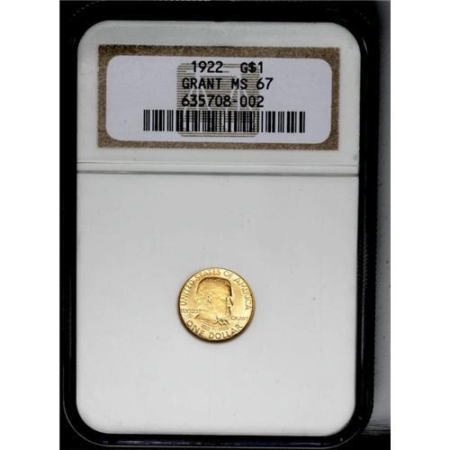 <B>1922<G$1> Grant No Star MS67 NGC.</B></I> Glints of mint-green occur in the protected areas of this predominantly sunset-orange Superb Gem example. This example has a complete lack of visible abrasions, spots, or other distractions, but its elusive combination of those factors into superb eye appeal it what truly makes it appropriate for this grade level. Census: 55 in 67, 1 finer (6/06).