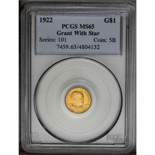 <B>1922<G$1> Grant With Star MS65 PCGS.</B></I> Enormously appealing, this Gem boasts superior deep orange-gold, consistent color on both sides. A small tick on General Grant's cheek is likely the only reason this piece does not claim an MS66 grade, for the luster is bold and the strike is impeccable.
