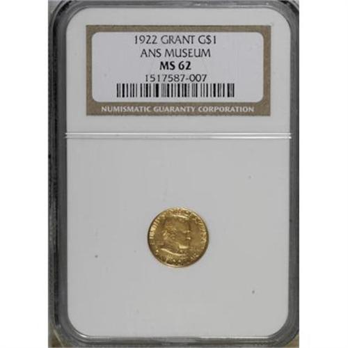 <B>1922 G$1 Grant no Star MS62 NGC.</B></I> Ex: ANS Museum. Despite the presence of a couple of tiny marks on General Grant's cheek, this lovely orange-gold piece offers much to commend itself, with good luster and a well-executed strike. A tiny, dotlike planchet lamination is noticed in the right obverse field.<BR><BR><b>Shipping:</b> Coins & Currency (<a target="_blank" href="http://www.heritageauctions.com/common/shipping.php">view shipping information</a>)