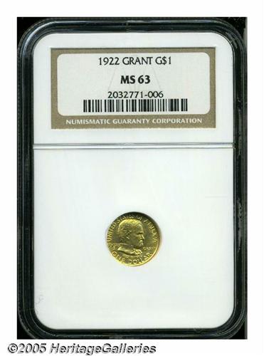 <B>1922<G$1> Grant no Star MS63 NGC.</B></I> Tinted a rich golden-orange color with bright, satiny luster. A very, very faint pinscratch diagonally traverses Grant's portrait, crossing just beneath the ear, and restricting the grade of this otherwise Gemlike example.