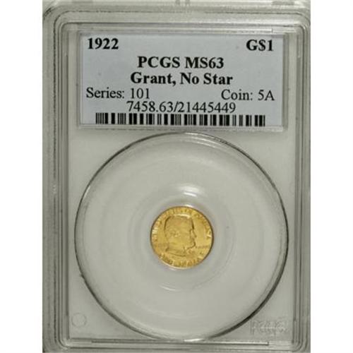 <B>1922 G$1 Grant no Star MS63 PCGS.</B></I> A vibrant canary-gold representative of the No Star variant, one of just 5,000 pieces coined, pleasingly detailed with excellent luster. Light, scattered flaws on both sides combine to limit the grade.<BR><I>From The Sterling Collection.</B></I><BR><BR><b>Shipping:</b> Coins & Currency (<a target="_blank" href="http://www.heritageauctions.com/common/shipping.php">view shipping information</a>)