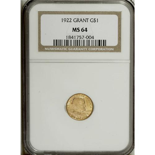 <B>1922 G$1 Grant no Star MS64 NGC.</B></I> Thanks to the assay pieces coined of the With Star variety, the No Star pieces actually have a lower mintage than their With Star counterparts. The highly lustrous surfaces are yellow-orange with a glint of amber on the highpoints. A few tiny marks and slight softness on Grant's head keep this visually appealing example from Gem status.<BR><BR><b>Shipping:</b> Coin/Currency (<a target="_blank" href="http://www.heritageauctions.com/common/shipping.php">view shipping information</a>)