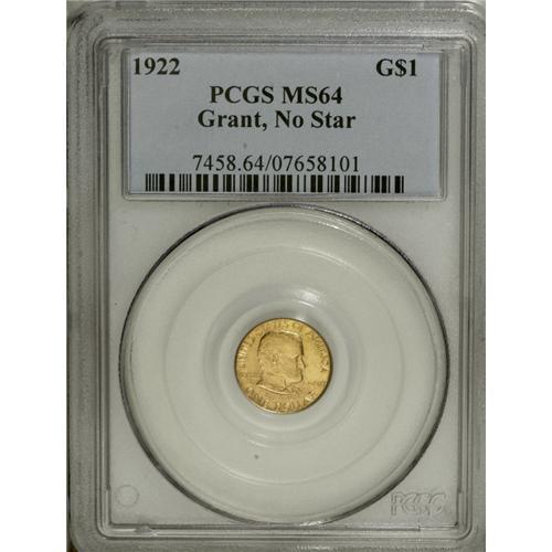 <B>1922 G$1 Grant no Star MS64 PCGS.</B></I> A splendid sun-gold representative of this low mintage commemorative issue. Nicely struck, and extended inspection beneath a loupe is required to find even insignificant contact. The same designs were used for a 1922 commemorative half dollar that also had Star and No Star varieties.<BR><BR><b>Shipping:</b> Coin/Currency (<a target="_blank" href="http://www.heritageauctions.com/common/shipping.php">view shipping information</a>)