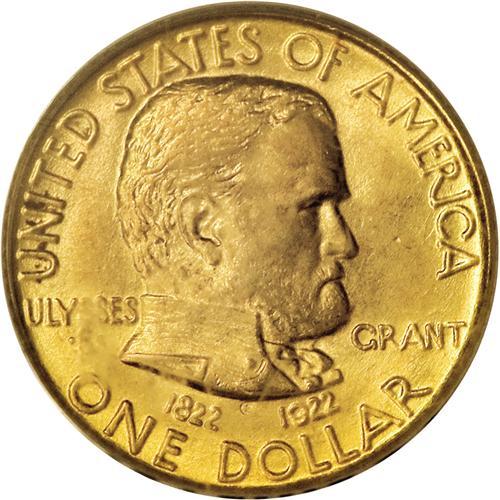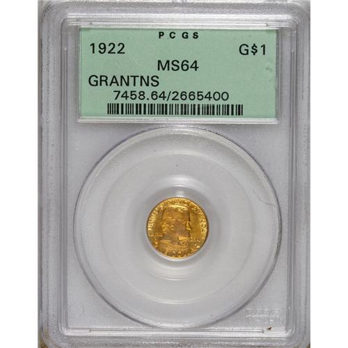 <B>1922 G$1 Grant no Star MS64 PCGS.</B></I> Marketing was alive and well in 1922, as the star device was removed from the With Star dies merely to create a second variety for sale. The lustrous surfaces show deep peach-gold coloration. A tiny scrape in the right obverse field appears under a loupe, although it is neither noticeable nor distracting otherwise. A nice coin for the grade, certified in a green-label holder.<BR><BR><b>Shipping:</b> Coins & Currency (<a target="_blank" href="http://www.heritageauctions.com/common/shipping.php">view shipping information</a>)