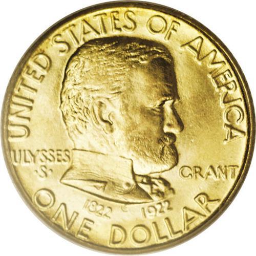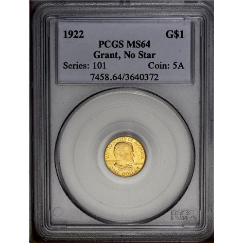 <B>1922<G$1> Grant No Star MS64 PCGS.</B></I> The identical motifs used on the Grant Memorial gold dollar were also used on the Grant Memorial half dollar, the only instance of such design duplication in the U.S. commemorative series. This No Star example displays bright orange and yellow-gold lustrous surfaces that show sharply defined design features. Some inoffensive wispy handling marks are noted on Grant's cheek and in the right obverse field.