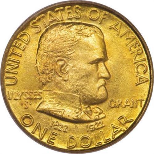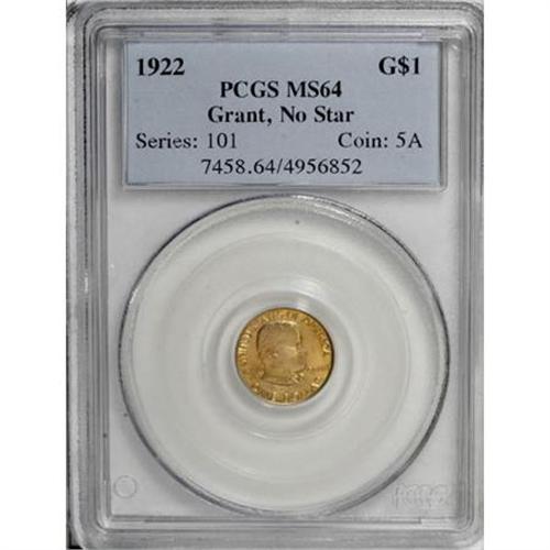 <B>1922 G$1 Grant no Star MS64 PCGS.</B></I> The satiny surfaces of this near-Gem have exceptional luster with rich orange-gold color. Both sides are sharply detailed and fully brilliant. Two varieties of the Grant half dollars and gold dollars were coined, each denomination having Star and No Star variations.<BR><BR><b>Shipping:</b> Coins & Currency (<a target="_blank" href="http://www.heritageauctions.com/common/shipping.php">view shipping information</a>)