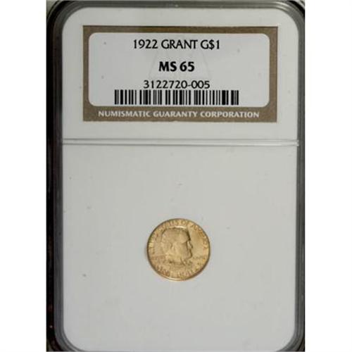 <B>1922 G$1 Grant no Star MS65 NGC.</B></I> The fields show glistening golden-orange color on both sides. A tiny planchet lamination in the right obverse field is as struck, but the myriad swirling die lines are definitely <I>not </B></I>to be confused with hairlines, as they are raised in the coin surface, from die polishing. An attractive Gem coin!<BR><I>From The Southwest Collection.</B></I><BR><BR><b>Shipping:</b> Coins & Currency (<a target="_blank" href="http://www.heritageauctions.com/common/shipping.php">view shipping information</a>)