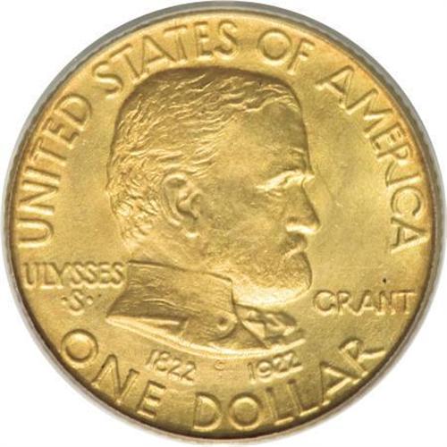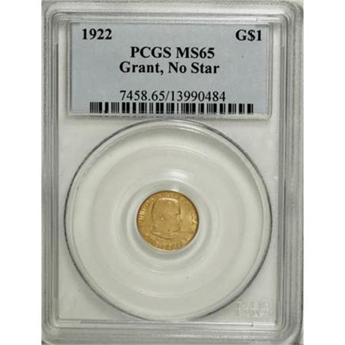<B>1922 G$1 Grant no Star MS65 PCGS.</B></I> This lustrous Gem displays peach-gold surfaces with subtle hints of light green. The strike is well executed, resulting in strong definition on the motifs, including the intricate reverse design. An unobtrusive handling mark or two is within the parameters of the grade designation.<BR><BR><b>Shipping:</b> Coins & Currency (<a target="_blank" href="http://www.heritageauctions.com/common/shipping.php">view shipping information</a>)
