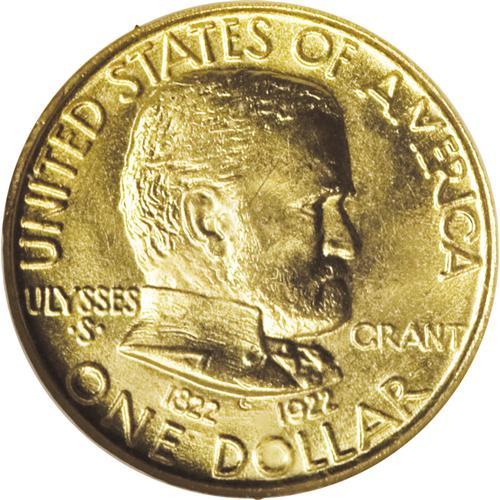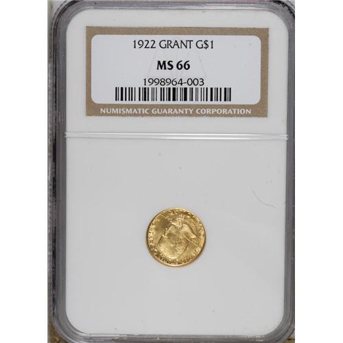 <B>1922 G$1 Grant no Star MS66 NGC.</B></I> Delightful yellow-gold, extremely lustrous surfaces are the hallmark of this splendid Premium Gem. A thin hairline scratch is noted at Grant's hairline when the coin is perused under a loupe and tilted at just the right angle, but it detracts little from the obvious appeal. Ulysses S. Grant was born in Point Pleasant, Ohio. President Warren G. Harding and the First Lady were among those present at Grant's birth centennial celebration on April 27, 1922, although Grant's direct descendants were absent.<BR><BR><b>Shipping:</b> Coins & Currency (<a target="_blank" href="http://www.heritageauctions.com/common/shipping.php">view shipping information</a>)