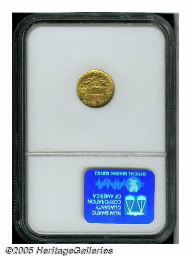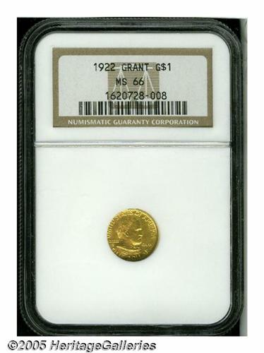 <B>1922<G$1> Grant no Star MS66 NGC.</B></I> Satiny golden luster on the obverse and reverse and highly attractive. The surfaces are a delight to study, with nary a nick or tick seen. Identifiable by a tiny planchet flake missing from the lower left corner of Grant's bust. Fairly well struck as even the elusive window panes are well formed on this Gem. Ever-popular in this grade and certain to please the discriminating numismatist.