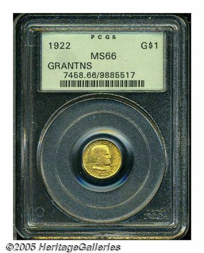 <B>1922<G$1> Grant no Star MS66 PCGS.</B></I> An attractive, satiny example of this issue and the scarcer of the two varieties by mintage. This No Star example boasts a production number of a mere 5,000 pieces. Some golden-orange patina is exhibited on each side. Housed in a green label PCGS holder.