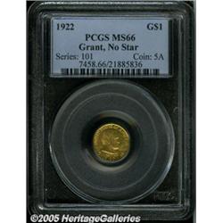 <B>1922 G$1 Grant no Star MS66 PCGS.</B></I> Bright green-gold patina dominates the problem-free surfaces, while the reverse shows a couple of small copper spots. Better struck than usually encountered on the tree trunk and nearby window of the log cabin.