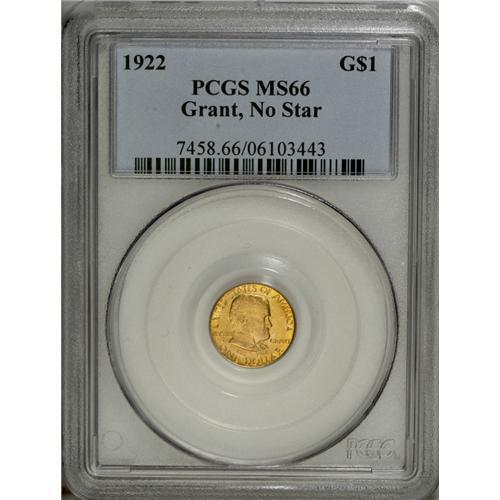 <B>1922 G$1 Grant no Star MS66 PCGS.</B></I> The beautifully deep apricot-gold, rose, and mint-green toning that adorns this immaculate Premium Gem is its most noteworthy attribute, and ensures a splendidly high degree of visual appeal. The piece is also well struck and highly lustrous: a virtually flawless specimen.<BR><BR><b>Shipping:</b> Coin/Currency (<a target="_blank" href="http://www.heritageauctions.com/common/shipping.php">view shipping information</a>)