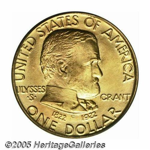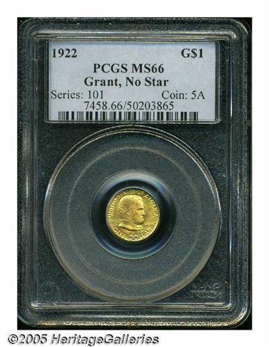 <B>1922<G$1> Grant no Star MS66 PCGS.</B></I> The frosty surfaces are highlighted in natural reddish patina, with flashes of lemon-yellow color emanating from the margins. Both the Gem status and originality of this low mintage commemorative issue are assured with one quick glance.
