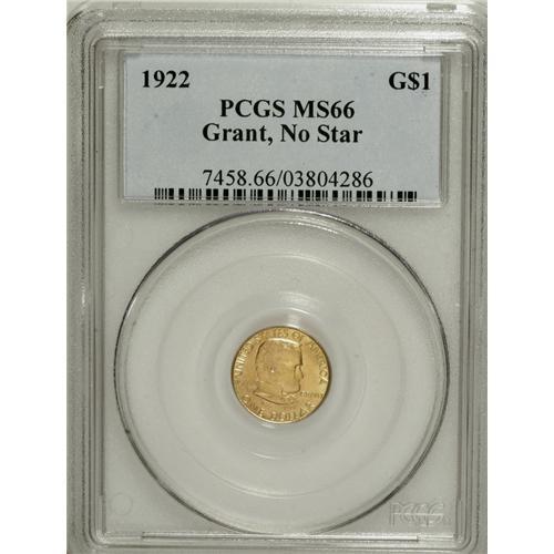 <B>1922 G$1 Grant no Star MS66 PCGS.</B></I> With many examples of this and the With Star issue delivered to dealer-speculators such as B. Max Mehl, many high-grade survivors such as the present piece are available to numismatists today. This pleasing piece has powerful luster and precise detail. The surfaces have delightful yellow-gold color with slightly deeper shades on the reverse.<BR><BR><b>Shipping:</b> Coins & Currency (<a target="_blank" href="http://www.heritageauctions.com/common/shipping.php">view shipping information</a>)