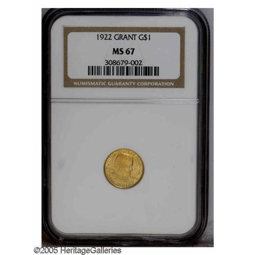 <B>1922<G$1> Grant no Star MS67 NGC.</B></I> This is a stunning Superb Gem example, and it is among the finest certified. In fact, just one coin has received a higher grade from NGC. The design details are extremely sharp, with only slight weakening of the tree trunk just left of the cabin window. This feature is weakly defined on nearly every existing example of this variety. The surfaces have rich and frosty honey-gold luster, providing exceptional eye appeal. Population: 49 in 67, 1 finer (10/05).