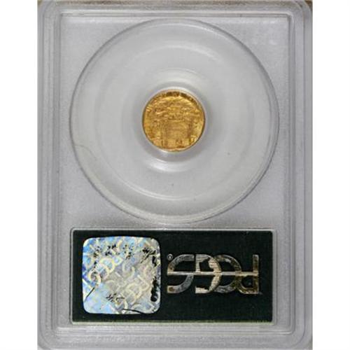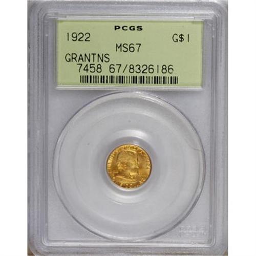 <B>1922 G$1 Grant no Star MS67 PCGS.</B></I> Bowers (1991) mentions that nearly all of the original mintage of Grant gold dollars (both with and without star) still exists. Despite the availability of Choice and even Gem examples, for the No Star variety, MS67 coins, such as the one in this lot, remain elusive. The strongly lustrous surfaces exhibit rich peach-gold and mint-green patination and are impeccably preserved. Sharp definition is noted on the design elements. Tied for the finest certified by PCGS (5/07).<BR><BR><b>Shipping:</b> Coins & Currency (<a target="_blank" href="http://www.heritageauctions.com/common/shipping.php">view shipping information</a>)