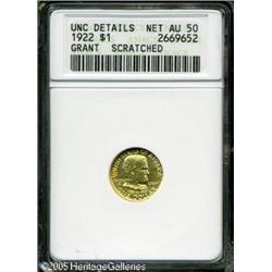 <B>1922 G$1 Grant no Star--Scratched--ANACS. Unc Details, Net AU50.</B></I> Brassy-gold, lustrous surfaces display a few minor pinscratches in the right obverse field. The design features are adequately impressed. Lot:8659