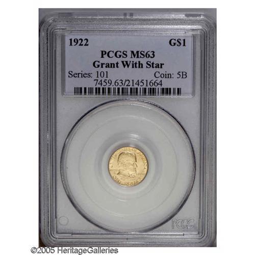 <B>1922<G$1> Grant with Star MS63 PCGS.</B></I> Deeply golden and semi-prooflike from highly polished dies, this piece is quite attractive. A tiny graze and a small abrasion, under the eye, restrict the grade.
