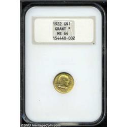 <table><tr><td><TABLE cellSpacing=0 cellPadding=0 width="100%" bgColor=#000000 border=0><TBODY> <TR><TD width="100%"><TABLE cellSpacing=1 cellPadding=3 width="100%" border=0><TBODY><TR><TD width="100%" bgColor=#79735c><FONT face=arial color=#ffffff size=3><B>Description</B> </FONT></TD></TR><TR><TD width="100%" bgColor=#ffffff><FONT face=arial size=2><B>1922 G$1 Grant with Star MS64 NGC.</B></I> A razor sharp, near-Gem example with appealing yellow-gold and reddish highlights.<BR><I>From The Sound Beach Collection.</B></I> </FONT></TD></TR></TBODY></TABLE></TD></TR></TBODY></TABLE><BR><A name=PricesRealized></A><TABLE cellSpacing=0 cellPadding=0 width="100%" bgColor=#000000 border=0><TBODY><TR><TD width="100%"><TABLE cellSpacing=1 cellPadding=3 width="100%" border=0><TBODY><TR><TD width="100%" bgColor=#79735c><A name=PR><FONT face=arial color=#ffffff size=3><B>Previous Prices from Heritage Auctions</B> </FONT></A></TD></TR><TR><TD bgColor=#f6f6ed><TABLE cellSpacing=0 cellPadding=0 width="100%" border=1><TBODY><TR><TD align=middle width="33%"><B>Date</B></TD><TD align=middle width="33%"><B>Service</B></TD><TD align=middle width="33%"><B>Price</B></TD></TR><TR bgColor=whitesmoke><TD width="33%"><B>03/23/2003</B></TD><TD width="33%">ANACS</TD><TD width="33%">$2,748.50</TD></TR><TR bgColor=whitesmoke><TD width="33%"><B>01/12/2002</B></TD><TD width="33%">ANACS</TD><TD width="33%">$3,450.00</TD></TR><TR bgColor=whitesmoke><TD width="33%"><B>08/08/2001</B></TD><TD width="33%">NGC</TD><TD width="33%">$2,070.00</TD></TR><TR bgColor=whitesmoke><TD width="33%"><B>05/31/2001</B></TD><TD width="33%">PCGS</TD><TD width="33%">$2,357.50</TD></TR><TR bgColor=whitesmoke><TD width="33%"><B>02/23/2001</B></TD><TD width="33%">PCGS</TD><TD width="33%">$2,185.00</TD></TR><TR bgColor=whitesmoke><TD width="33%"><B>06/10/2000</B></TD><TD width="33%">PCGS</TD><TD width="33%">$2,012.50</TD></TR><TR bgColor=whitesmoke><TD width="33%"><B>08/14/1999</B></TD><TD width="33%">PCGS</TD><TD width="33%">$1,955.00</TD></TR><TR bgColor=whitesmoke><TD width="33%"><B>08/07/1998</B></TD><TD width="33%">NGC</TD><TD width="33%">$1,610.00</TD></TR><TR bgColor=whitesmoke><TD width="33%"><B>02/02/1996</B></TD><TD width="33%">PCGS</TD><TD width="33%">$1,760.00</TD></TR><TR bgColor=whitesmoke><TD width="33%"><B>07/26/1994</B></TD><TD width="33%">PCGS</TD><TD width="33%">$1,925.00</TD></TR><TR bgColor=whitesmoke><TD width="33%"><B>07/27/1993</B></TD><TD width="33%">PCGS</TD><TD width="33%">$2,145.00</TD></TR></TBODY></TABLE></TD></TR><TR><TD bgColor=#ffffff><FONT face=arial size=1 ?>PLEASE NOTE: All prices realized reflect the final hammer price PLUS the buyer's premium in auctions that charge a buyer's premium. Each item has a notation at the top of the listing indicating whether that lot included a buyer's premium. Example: A item that sells with a final hammer price of $100 and a 20% buyer's premium will display with a price realized of $120. All information listed is intended to be as accurate as possible, but errors are possible. Please use this guide carefully and inform us of any inaccuracies. </FONT></TD></TR></TBODY></TABLE></TD></TR></TBODY></TABLE><BR><TABLE cellSpacing=0 cellPadding=0 width="100%" bgColor=#000000 border=0><TBODY><TR><TD width="100%"><TABLE cellSpacing=1 cellPadding=3 width="100%" border=0><TBODY><TR><TD width="100%" bgColor=#79735c colSpan=6><FONT face=arial color=#ffffff size=3><B>Price Guide*</B> </FONT></TD></TR><TR bgColor=#f6f6ed><TD align=middle><B>Grade</B> </TD><TD align=middle><B>Coin World<BR>(Trends)</B> </TD><TD align=middle><B>Numismedia<BR>Retail</B> </TD><TD align=middle><B>Numismedia<BR>Wholesale</B> </TD><TD align=middle><B>Coin<BR>Universe</B> </TD><TD align=middle><B>Heritage<BR>Value Index</B> </TD></TR><TR bgColor=#ffffff><TD align=middle>63</TD><TD align=right>$2,100.00</TD><TD align=right>---</TD><TD align=right>$1,575.00</TD><TD align=right>$1,800.00</TD><TD align=right>$1,447.50</TD></TR><TR style="FONT-WEIGHT: bold" bgColor=#cccfdd><TD align=middle>64</TD><TD align=right>$3,500.00</TD><TD align=right>---</TD><TD align=right>$2,165.00</TD><TD align=right>$2,900.00</TD><TD align=right>$2,215.63</TD></TR><TR bgColor=#ffffff><TD align=middle>65</TD><TD align=right>$4,000.00</TD><TD align=right>---</TD><TD align=right>$2,575.00</TD><TD align=right>$3,750.00</TD><TD align=right>$2,661.00</TD></TR><TR bgColor=#ffffff><TD colSpan=6><FONT size=1>*All information listed is intended to be as accurate as possible, but errors are possible. No item may be returned or refused based on this information which is provided as a service to our customers. You should contact each pricing source directly to determine the accuracy of this information. </FONT></TD></TR></TBODY></TABLE></TD></TR></TBODY></TABLE><BR><TABLE cellSpacing=0 cellPadding=0 width="100%" bgColor=#000000 border=0><TBODY><TR><TD width="100%"><TABLE cellSpacing=1 cellPadding=3 width="100%" border=0><TBODY><TR><TD width="100%" bgColor=#79735c><FONT face=arial color=#ffffff size=3><B>Population Guide</B> </FONT></TD></TR><TR bgColor=#ffffff><TD align=middle><!-- Begin Output of Population Grid--><TABLE cellSpacing=0 cellPadding=0 width="100%" border=0><TBODY><TR><TD vAlign=center><TABLE cellSpacing=0 width="100%" border=1 cellsadding="3"><TBODY><TR><TD vAlign=center><TABLE cellSpacing=0 cellPadding=3 width="100%" border=1><TBODY><TR><TD vAlign=center align=middle bgColor=#f0f1e8 colSpan=2 <CENTER><FONT face=Arial size=2><B>PCGS Pop </B></FONT><CENTER></CENTER></TD><TD vAlign=center align=middle bgColor=#f0f1e8 colSpan=2><CENTER><FONT face=Arial size=2><B>NGC Pop</B></CENTER></FONT></TD></TR><TR><TD vAlign=center><FONT face=Arial size=2>(64)</FONT> </TD><TD vAlign=center align=right><FONT face=Arial size=2>513</FONT> </TD><TD vAlign=center><FONT face=Arial size=2>(64)</FONT> </TD><TD vAlign=center align=right><FONT face=Arial size=2>250</FONT> </TD></TR><TR><TD vAlign=center><FONT face=Arial size=2>(>64)</FONT> </TD><TD vAlign=center align