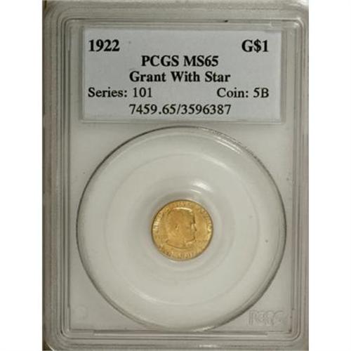 <B>1922 G$1 Grant with Star MS65 PCGS.</B></I> A well struck representative of this mostly yellow-gold Grant With Star gold dollar. Reddish hues are visible when rotated under a light source, making this Gem an eye-appealing example. Designed by Laura Gardin Fraser, wife of the designer of the Buffalo five cent piece, James Earle Fraser.<BR><BR><b>Shipping:</b> Coins & Currency (<a target="_blank" href="http://www.heritageauctions.com/common/shipping.php">view shipping information</a>)